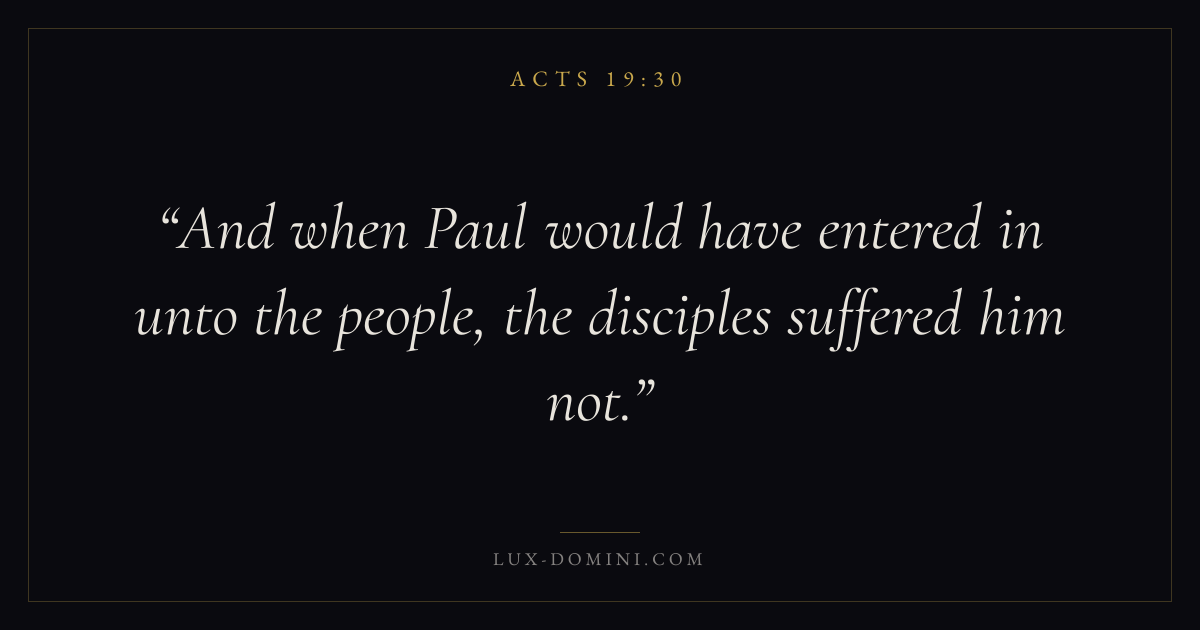 Books / Acts / Chapter 19 / Verse 30 ← Acts 19:29 Acts 19:30 Acts 19:31 → And when Paul would have entered in unto the people, the disciples suffered him not. Download verse card Share on Twitter Share on Facebook Pin it ✦ Key themes Suffering and trialsPrayerTruthSpirit Read with Acts 19:26Acts 19:27Romans 8:182 Corinthians 4:17 Related topics Bible verses about suffering and trialsBible verses about prayerBible verses about truth ✦ Acts Chapter 19 verses V. 1 V. 2 V. 3 V. 4 V. 5 V. 6 V. 7 V. 8 V. 9 V. 10 V. 11 V. 12 V. 13 V. 14 V. 15 V. 16 V. 17 V. 18 V. 19 V. 20 V. 21 V. 22 V. 23 V. 24 V. 25 V. 26 V. 27 V. 28 V. 29 V. 30 V. 31 V. 32 V. 33 V. 34 V. 35 V. 36 V. 37 V. 38 V. 39 V. 40 V. 41