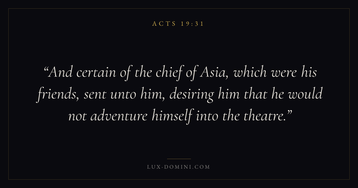 And certain of the chief of Asia, which were his friends, sent unto him, desiring him that he would not adventure himself into the theatre.