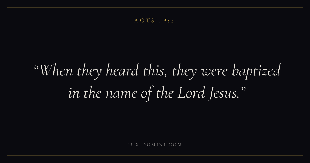 Books / Acts / Chapter 19 / Verse 5 ← Acts 19:4 Acts 19:5 Acts 19:6 → When they heard this, they were baptized in the name of the Lord Jesus. Download verse card Share on Twitter Share on Facebook Pin it ✦ Key themes Suffering and trialsPrayerTruthSpirit Read with Acts 19:6Acts 19:7Romans 8:182 Corinthians 4:17 Related topics Bible verses about suffering and trialsBible verses about prayerBible verses about truth ✦ Acts Chapter 19 verses V. 1 V. 2 V. 3 V. 4 V. 5 V. 6 V. 7 V. 8 V. 9 V. 10 V. 11 V. 12 V. 13 V. 14 V. 15 V. 16 V. 17 V. 18 V. 19 V. 20 V. 21 V. 22 V. 23 V. 24 V. 25 V. 26 V. 27 V. 28 V. 29 V. 30 V. 31 V. 32 V. 33 V. 34 V. 35 V. 36 V. 37 V. 38 V. 39 V. 40 V. 41