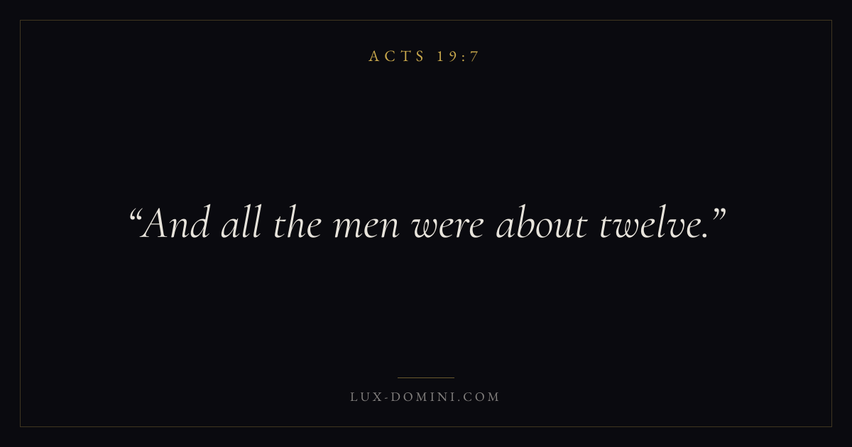 Books / Acts / Chapter 19 / Verse 7 ← Acts 19:6 Acts 19:7 Acts 19:8 → And all the men were about twelve. Download verse card Share on Twitter Share on Facebook Pin it ✦ Key themes Suffering and trialsPrayerTruthSpirit Read with Acts 19:5Acts 19:6Romans 8:182 Corinthians 4:17 Related topics Bible verses about suffering and trialsBible verses about prayerBible verses about truth ✦ Acts Chapter 19 verses V. 1 V. 2 V. 3 V. 4 V. 5 V. 6 V. 7 V. 8 V. 9 V. 10 V. 11 V. 12 V. 13 V. 14 V. 15 V. 16 V. 17 V. 18 V. 19 V. 20 V. 21 V. 22 V. 23 V. 24 V. 25 V. 26 V. 27 V. 28 V. 29 V. 30 V. 31 V. 32 V. 33 V. 34 V. 35 V. 36 V. 37 V. 38 V. 39 V. 40 V. 41