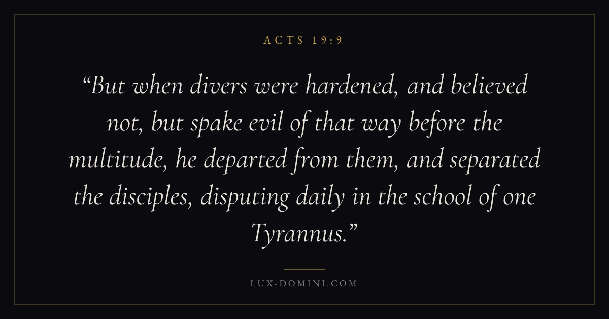 But when divers were hardened, and believed not, but spake evil of that way before the multitude, he departed from them, and separated the disciples, disputing daily in the school of one Tyrannus.