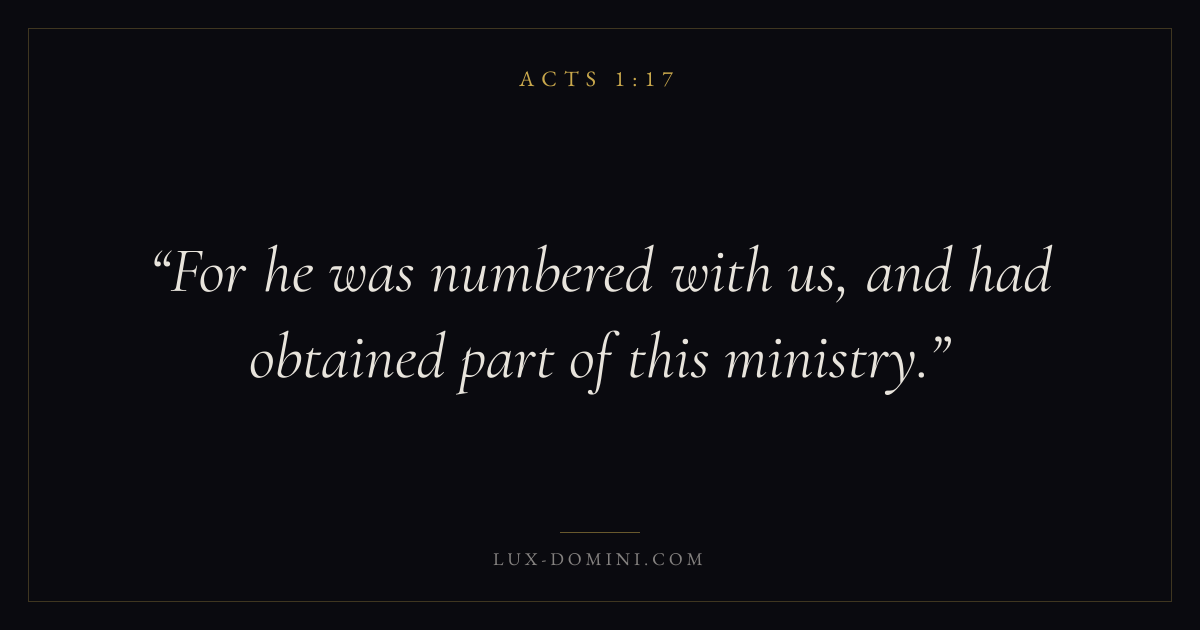 Books / Acts / Chapter 1 / Verse 17 ← Acts 1:16 Acts 1:17 Acts 1:18 → For he was numbered with us, and had obtained part of this ministry. Download verse card Share on Twitter Share on Facebook Pin it ✦ Key themes HopeSuffering and trialsPrayerEternal lifeSpirit Read with Acts 1:15Acts 1:16Romans 8:24Revelation 21:4 Related topics Bible verses about hopeBible verses about suffering and trialsBible verses about prayerBible verses about eternal life ✦ Acts Chapter 1 verses V. 1 V. 2 V. 3 V. 4 V. 5 V. 6 V. 7 V. 8 V. 9 V. 10 V. 11 V. 12 V. 13 V. 14 V. 15 V. 16 V. 17 V. 18 V. 19 V. 20 V. 21 V. 22 V. 23 V. 24 V. 25 V. 26