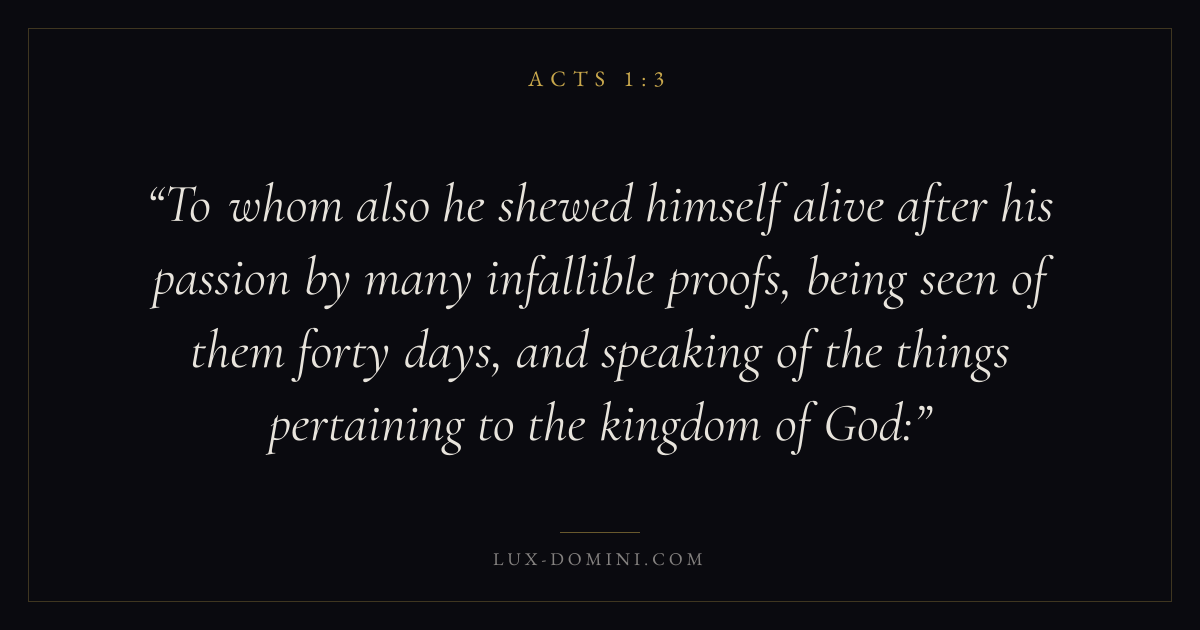 To whom also he shewed himself alive after his passion by many infallible proofs, being seen of them forty days, and speaking of the things pertaining to the kingdom of God: