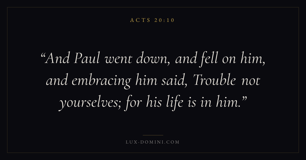 And Paul went down, and fell on him, and embracing him said, Trouble not yourselves; for his life is in him.