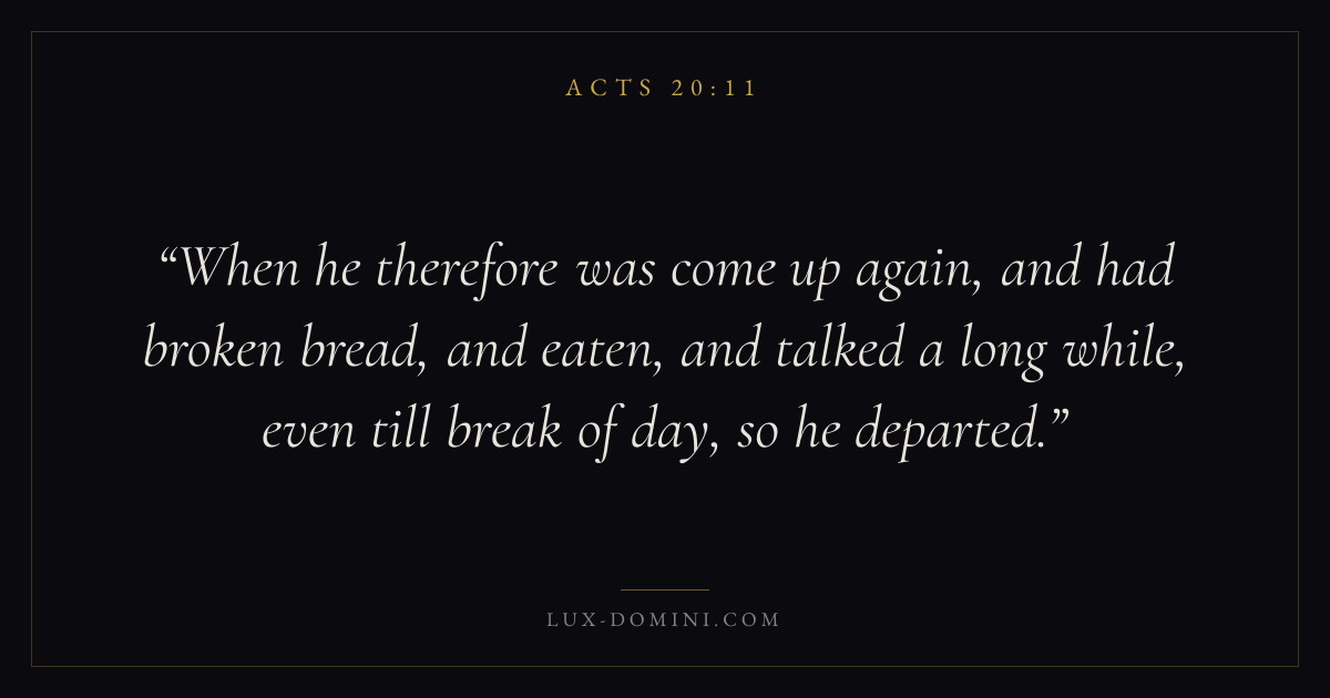 When he therefore was come up again, and had broken bread, and eaten, and talked a long while, even till break of day, so he departed.
