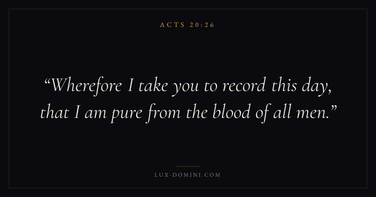 Books / Acts / Chapter 20 / Verse 26 ← Acts 20:25 Acts 20:26 Acts 20:27 → Wherefore I take you to record this day, that I am pure from the blood of all men. Download verse card Share on Twitter Share on Facebook Pin it ✦ Key themes Suffering and trialsPrayerHumilityTruthSpirit Read with Acts 20:22Acts 20:23Romans 8:182 Corinthians 4:17 Related topics Bible verses about suffering and trialsBible verses about prayerBible verses about humilityBible verses about truth ✦ Acts Chapter 20 verses V. 1 V. 2 V. 3 V. 4 V. 5 V. 6 V. 7 V. 8 V. 9 V. 10 V. 11 V. 12 V. 13 V. 14 V. 15 V. 16 V. 17 V. 18 V. 19 V. 20 V. 21 V. 22 V. 23 V. 24 V. 25 V. 26 V. 27 V. 28 V. 29 V. 30 V. 31 V. 32 V. 33 V. 34 V. 35 V. 36 V. 37 V. 38