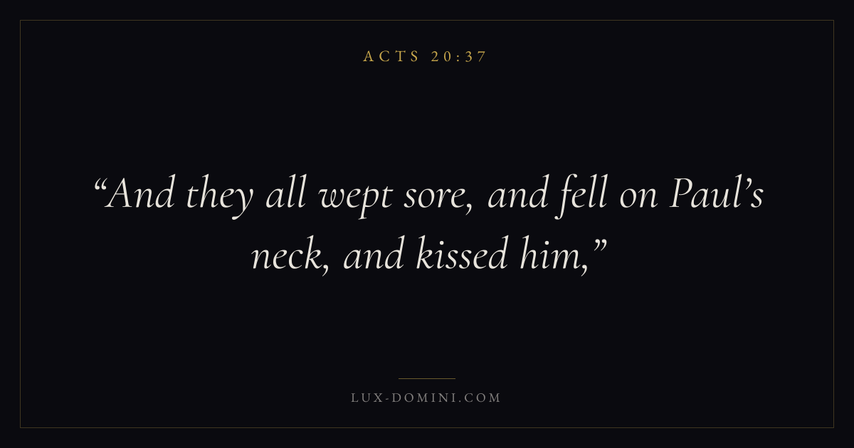 Books / Acts / Chapter 20 / Verse 37 ← Acts 20:36 Acts 20:37 Acts 20:38 → And they all wept sore, and fell on Paul’s neck, and kissed him, Download verse card Share on Twitter Share on Facebook Pin it ✦ Key themes FaithSuffering and trialsPrayerTruthSpirit Read with Acts 20:36Acts 20:38Hebrews 11:1Romans 10:17 Related topics Bible verses about faithBible verses about suffering and trialsBible verses about prayerBible verses about truth ✦ Acts Chapter 20 verses V. 1 V. 2 V. 3 V. 4 V. 5 V. 6 V. 7 V. 8 V. 9 V. 10 V. 11 V. 12 V. 13 V. 14 V. 15 V. 16 V. 17 V. 18 V. 19 V. 20 V. 21 V. 22 V. 23 V. 24 V. 25 V. 26 V. 27 V. 28 V. 29 V. 30 V. 31 V. 32 V. 33 V. 34 V. 35 V. 36 V. 37 V. 38