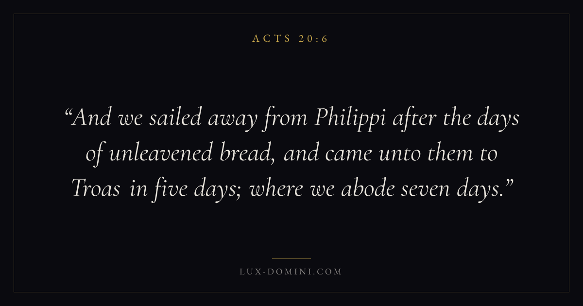 And we sailed away from Philippi after the days of unleavened bread, and came unto them to Troas in five days; where we abode seven days.