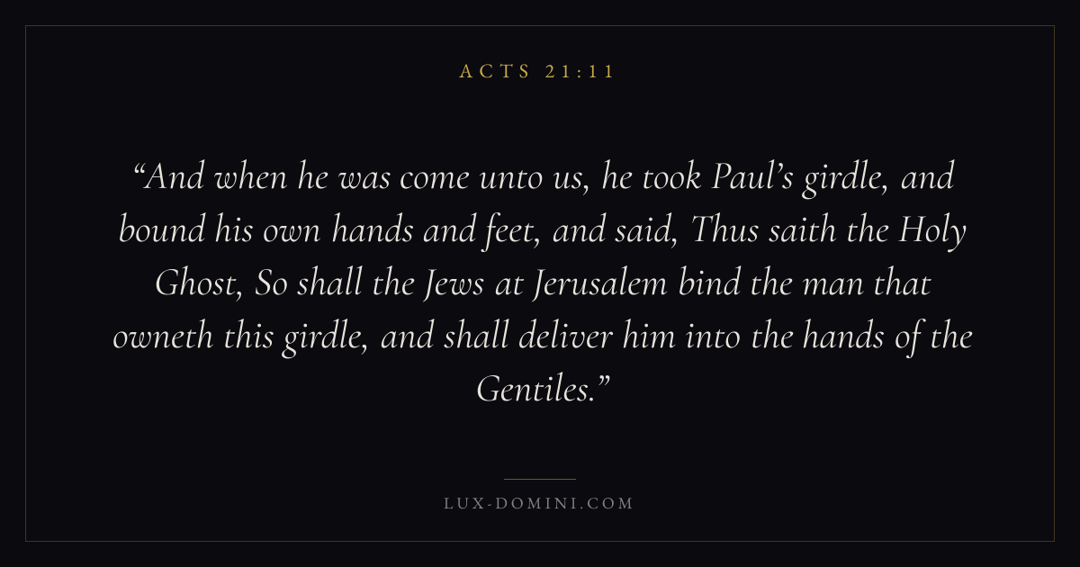 And when he was come unto us, he took Paul’s girdle, and bound his own hands and feet, and said, Thus saith the Holy Ghost, So shall the Jews at Jerusalem bind the man that owneth this girdle, and shall deliver him into the hands of the Gentiles.
