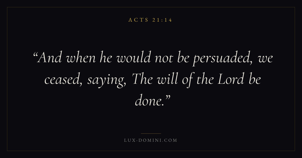 Books / Acts / Chapter 21 / Verse 14 ← Acts 21:13 Acts 21:14 Acts 21:15 → And when he would not be persuaded, we ceased, saying, The will of the Lord be done. Download verse card Share on Twitter Share on Facebook Pin it ✦ Key themes Anxiety and fearSuffering and trialsPrayerTruthSpirit Read with Acts 21:11Acts 21:12Philippians 4:6Isaiah 41:10 Related topics Bible verses about anxiety and fearBible verses about suffering and trialsBible verses about prayerBible verses about truth ✦ Acts Chapter 21 verses V. 1 V. 2 V. 3 V. 4 V. 5 V. 6 V. 7 V. 8 V. 9 V. 10 V. 11 V. 12 V. 13 V. 14 V. 15 V. 16 V. 17 V. 18 V. 19 V. 20 V. 21 V. 22 V. 23 V. 24 V. 25 V. 26 V. 27 V. 28 V. 29 V. 30 V. 31 V. 32 V. 33 V. 34 V. 35 V. 36 V. 37 V. 38 V. 39 V. 40