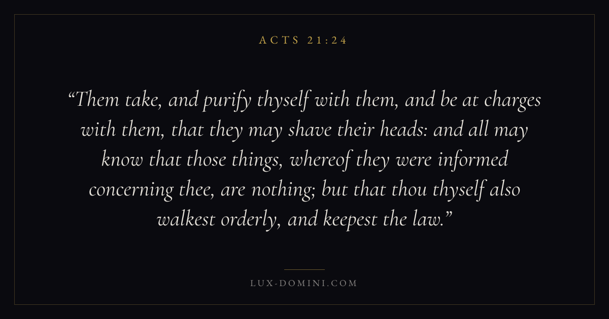Them take, and purify thyself with them, and be at charges with them, that they may shave their heads: and all may know that those things, whereof they were informed concerning thee, are nothing; but that thou thyself also walkest orderly, and keepest the law.