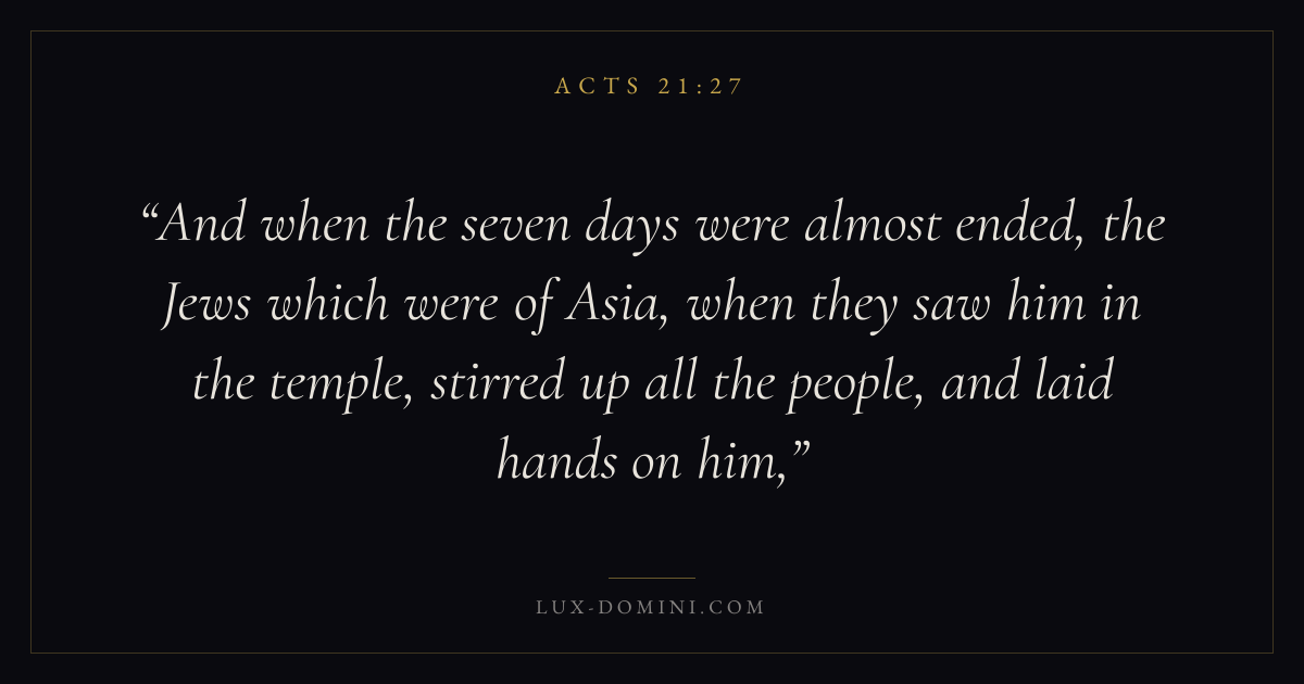 And when the seven days were almost ended, the Jews which were of Asia, when they saw him in the temple, stirred up all the people, and laid hands on him,