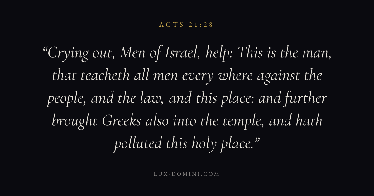 Crying out, Men of Israel, help: This is the man, that teacheth all men every where against the people, and the law, and this place: and further brought Greeks also into the temple, and hath polluted this holy place.