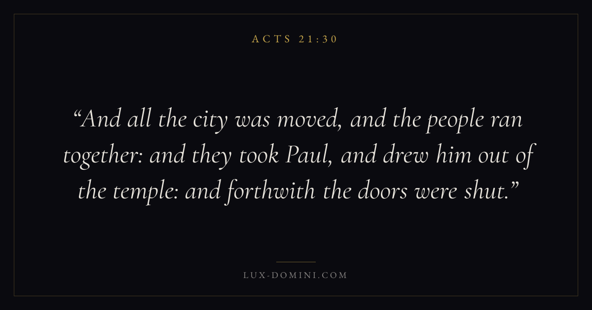 And all the city was moved, and the people ran together: and they took Paul, and drew him out of the temple: and forthwith the doors were shut.