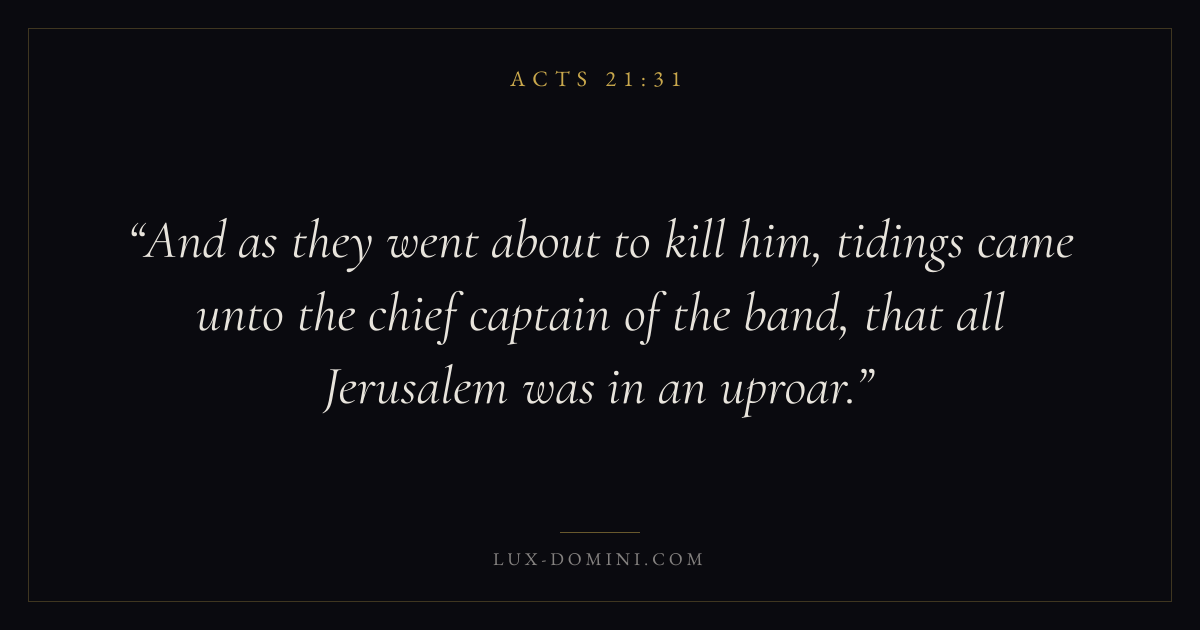 And as they went about to kill him, tidings came unto the chief captain of the band, that all Jerusalem was in an uproar.