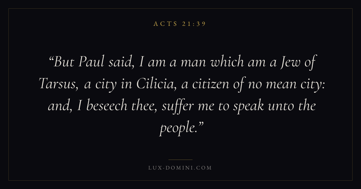 But Paul said, I am a man which am a Jew of Tarsus, a city in Cilicia, a citizen of no mean city: and, I beseech thee, suffer me to speak unto the people.