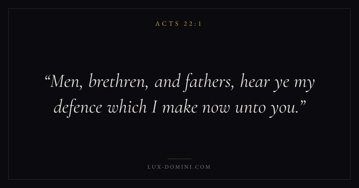 Books / Acts / Chapter 22 / Verse 1 ← Acts 21:40 Acts 22:1 Acts 22:2 → Men, brethren, and fathers, hear ye my defence which I make now unto you. Download verse card Share on Twitter Share on Facebook Pin it ✦ Key themes Suffering and trialsPrayerTruthSpirit Read with Acts 22:2Acts 22:3Romans 8:182 Corinthians 4:17 Related topics Bible verses about suffering and trialsBible verses about prayerBible verses about truth ✦ Acts Chapter 22 verses V. 1 V. 2 V. 3 V. 4 V. 5 V. 6 V. 7 V. 8 V. 9 V. 10 V. 11 V. 12 V. 13 V. 14 V. 15 V. 16 V. 17 V. 18 V. 19 V. 20 V. 21 V. 22 V. 23 V. 24 V. 25 V. 26 V. 27 V. 28 V. 29 V. 30