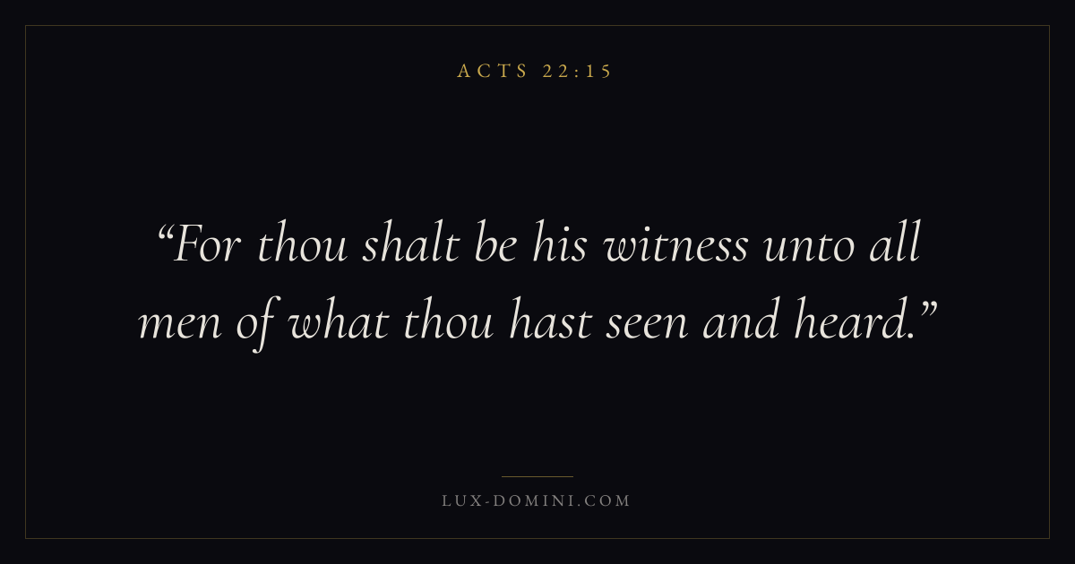 Books / Acts / Chapter 22 / Verse 15 ← Acts 22:14 Acts 22:15 Acts 22:16 → For thou shalt be his witness unto all men of what thou hast seen and heard. Download verse card Share on Twitter Share on Facebook Pin it ✦ Key themes Suffering and trialsPrayerWisdomTruthSpirit Read with Acts 22:16Acts 22:17Romans 8:182 Corinthians 4:17 Related topics Bible verses about suffering and trialsBible verses about prayerBible verses about wisdomBible verses about truth ✦ Acts Chapter 22 verses V. 1 V. 2 V. 3 V. 4 V. 5 V. 6 V. 7 V. 8 V. 9 V. 10 V. 11 V. 12 V. 13 V. 14 V. 15 V. 16 V. 17 V. 18 V. 19 V. 20 V. 21 V. 22 V. 23 V. 24 V. 25 V. 26 V. 27 V. 28 V. 29 V. 30