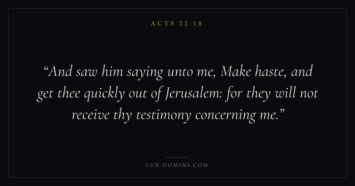 And saw him saying unto me, Make haste, and get thee quickly out of Jerusalem: for they will not receive thy testimony concerning me.
