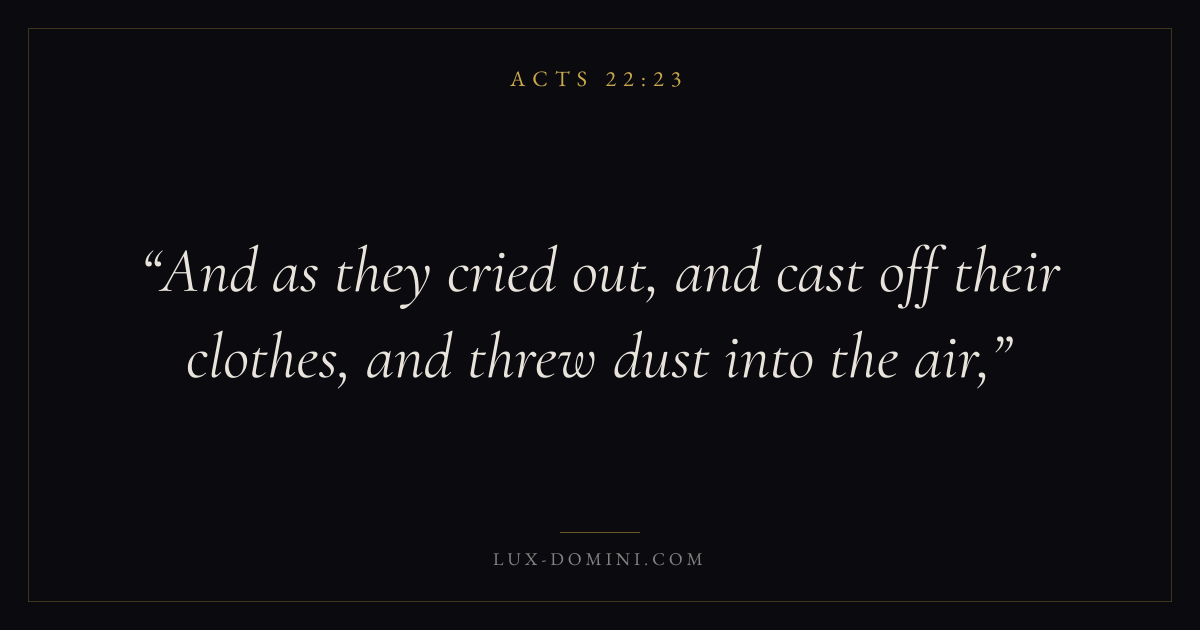 Books / Acts / Chapter 22 / Verse 23 ← Acts 22:22 Acts 22:23 Acts 22:24 → And as they cried out, and cast off their clothes, and threw dust into the air, Download verse card Share on Twitter Share on Facebook Pin it ✦ Key themes Suffering and trialsPrayerTruthSpirit Read with Acts 22:20Acts 22:21Romans 8:182 Corinthians 4:17 Related topics Bible verses about suffering and trialsBible verses about prayerBible verses about truth ✦ Acts Chapter 22 verses V. 1 V. 2 V. 3 V. 4 V. 5 V. 6 V. 7 V. 8 V. 9 V. 10 V. 11 V. 12 V. 13 V. 14 V. 15 V. 16 V. 17 V. 18 V. 19 V. 20 V. 21 V. 22 V. 23 V. 24 V. 25 V. 26 V. 27 V. 28 V. 29 V. 30