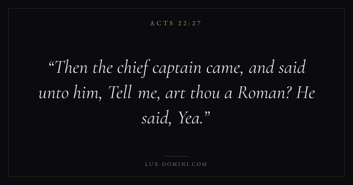 Books / Acts / Chapter 22 / Verse 27 ← Acts 22:26 Acts 22:27 Acts 22:28 → Then the chief captain came, and said unto him, Tell me, art thou a Roman? He said, Yea. Download verse card Share on Twitter Share on Facebook Pin it ✦ Key themes Suffering and trialsPrayerTruthSpirit Read with Acts 22:25Acts 22:26Romans 8:182 Corinthians 4:17 Related topics Bible verses about suffering and trialsBible verses about prayerBible verses about truth ✦ Acts Chapter 22 verses V. 1 V. 2 V. 3 V. 4 V. 5 V. 6 V. 7 V. 8 V. 9 V. 10 V. 11 V. 12 V. 13 V. 14 V. 15 V. 16 V. 17 V. 18 V. 19 V. 20 V. 21 V. 22 V. 23 V. 24 V. 25 V. 26 V. 27 V. 28 V. 29 V. 30