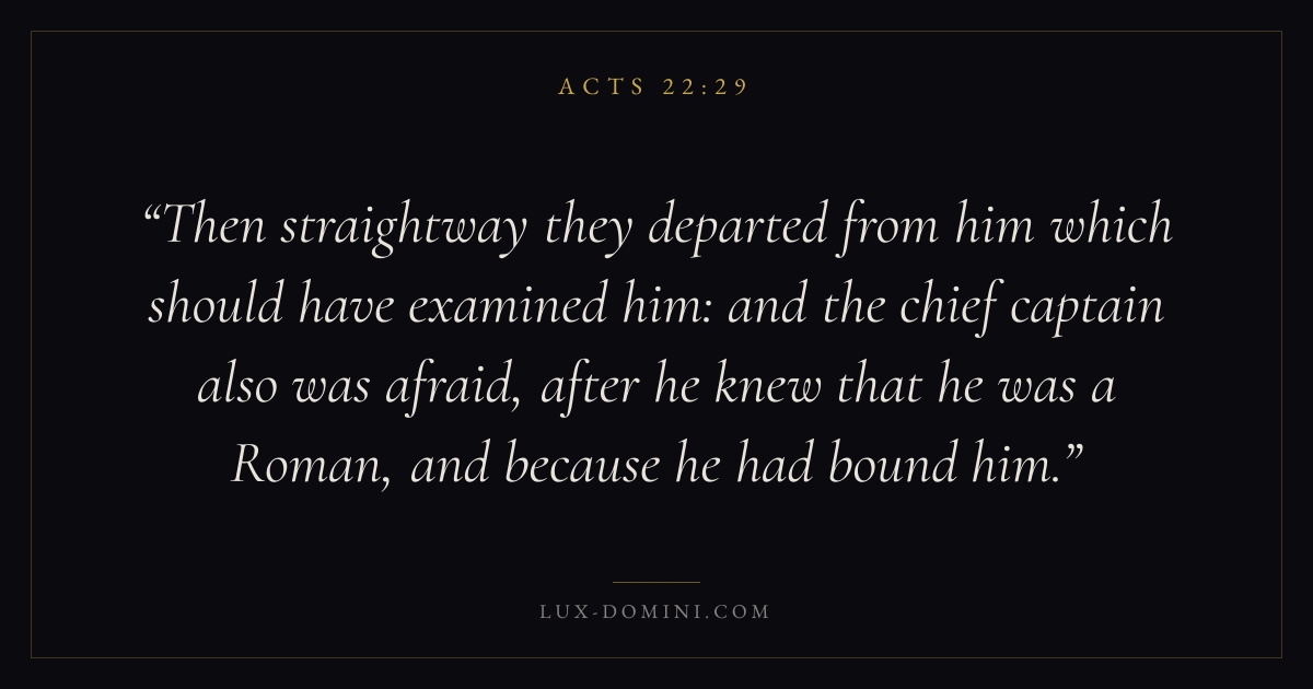 Then straightway they departed from him which should have examined him: and the chief captain also was afraid, after he knew that he was a Roman, and because he had bound him.