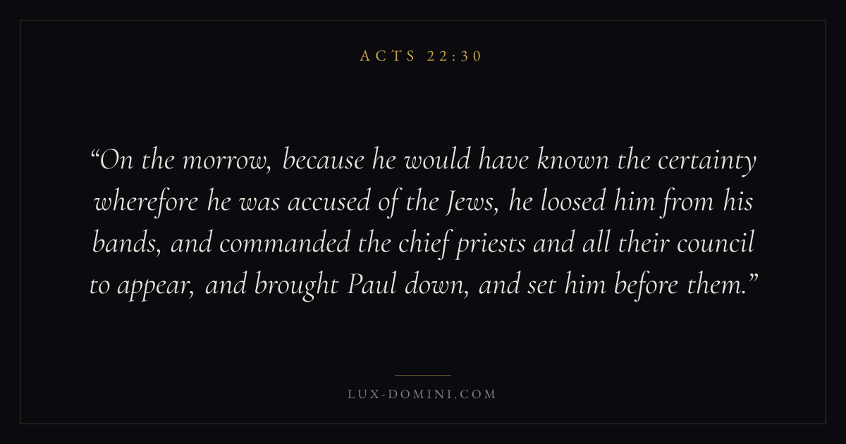 On the morrow, because he would have known the certainty wherefore he was accused of the Jews, he loosed him from his bands, and commanded the chief priests and all their council to appear, and brought Paul down, and set him before them.