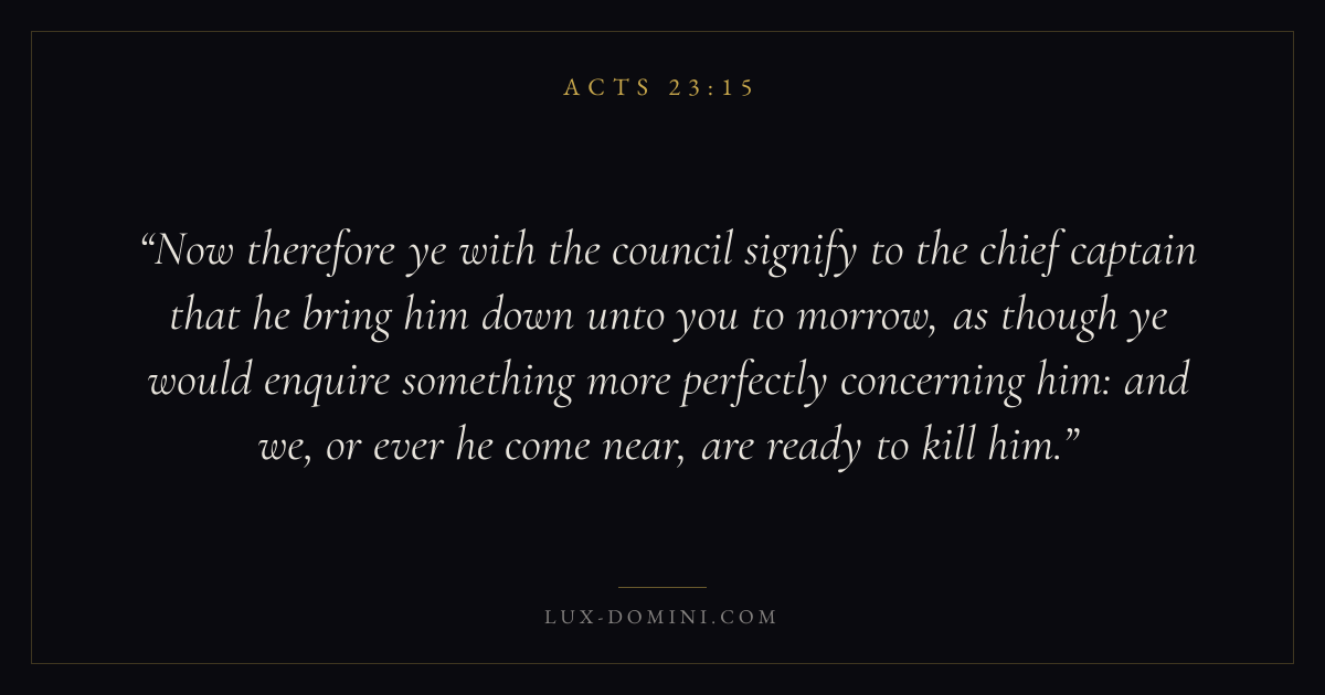 Now therefore ye with the council signify to the chief captain that he bring him down unto you to morrow, as though ye would enquire something more perfectly concerning him: and we, or ever he come near, are ready to kill him.