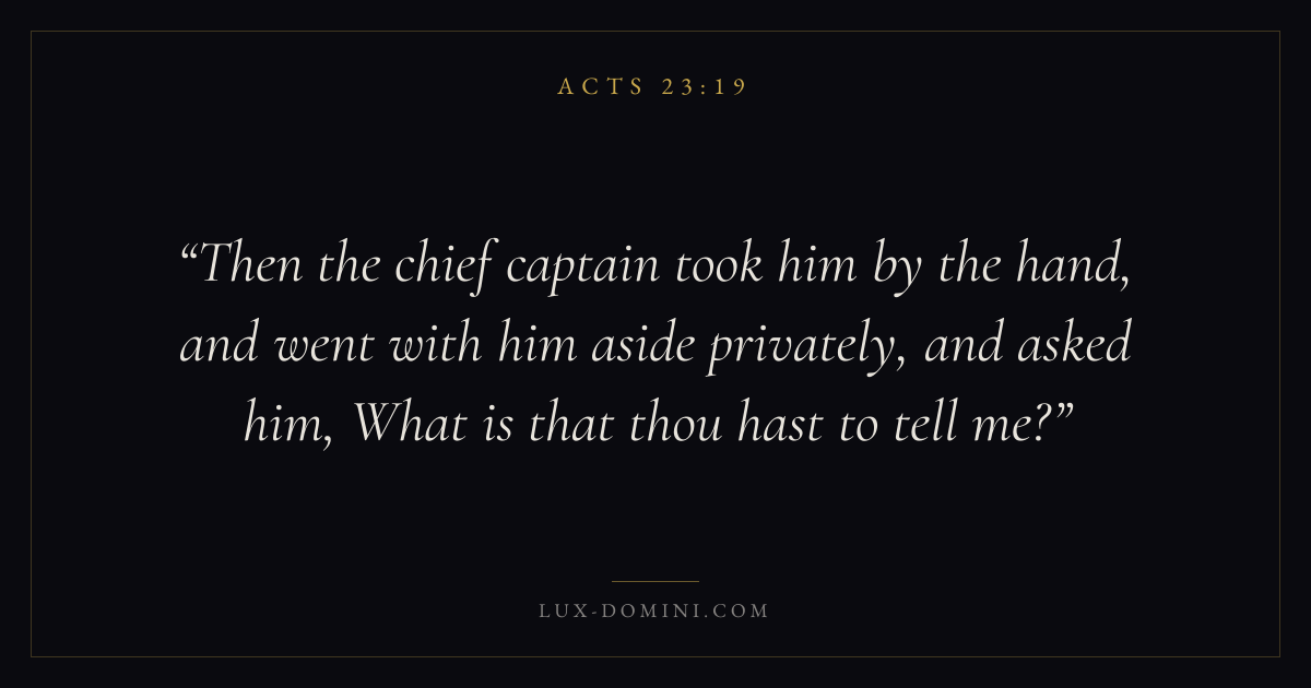 Then the chief captain took him by the hand, and went with him aside privately, and asked him, What is that thou hast to tell me?