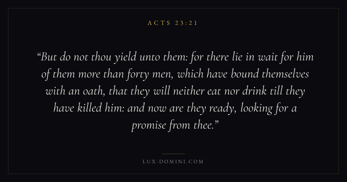 But do not thou yield unto them: for there lie in wait for him of them more than forty men, which have bound themselves with an oath, that they will neither eat nor drink till they have killed him: and now are they ready, looking for a promise from thee.
