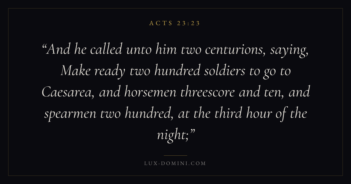 And he called unto him two centurions, saying, Make ready two hundred soldiers to go to Caesarea, and horsemen threescore and ten, and spearmen two hundred, at the third hour of the night;