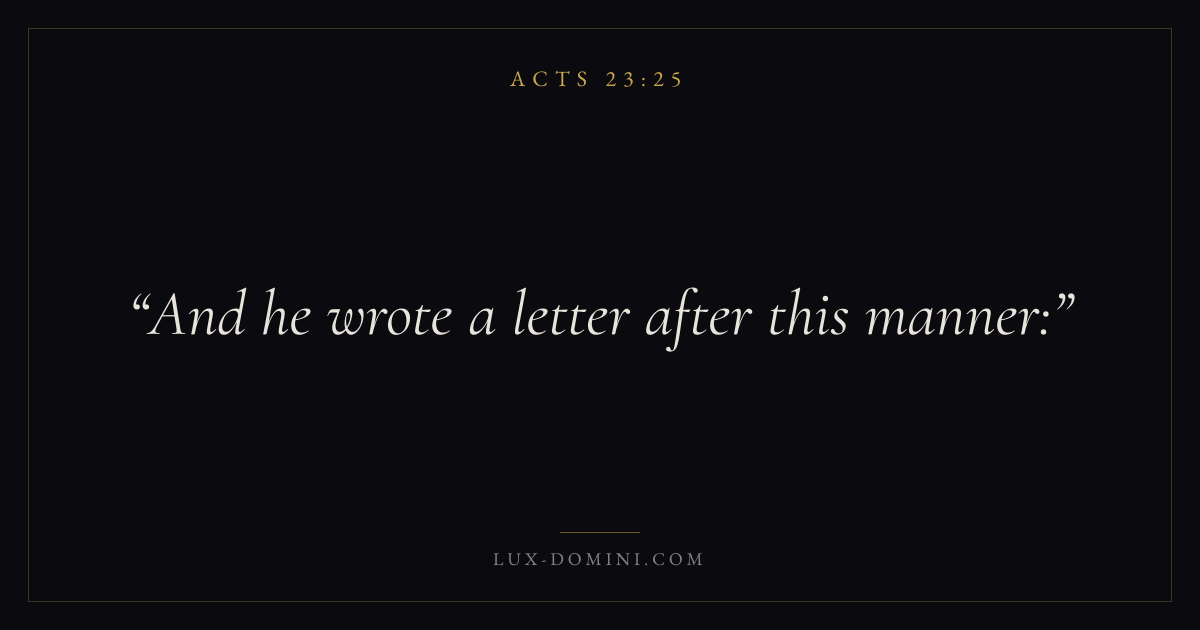 Books / Acts / Chapter 23 / Verse 25 ← Acts 23:24 Acts 23:25 Acts 23:26 → And he wrote a letter after this manner: Download verse card Share on Twitter Share on Facebook Pin it ✦ Key themes Suffering and trialsPrayerTruthSpirit Read with Acts 23:21Acts 23:22Romans 8:182 Corinthians 4:17 Related topics Bible verses about suffering and trialsBible verses about prayerBible verses about truth ✦ Acts Chapter 23 verses V. 1 V. 2 V. 3 V. 4 V. 5 V. 6 V. 7 V. 8 V. 9 V. 10 V. 11 V. 12 V. 13 V. 14 V. 15 V. 16 V. 17 V. 18 V. 19 V. 20 V. 21 V. 22 V. 23 V. 24 V. 25 V. 26 V. 27 V. 28 V. 29 V. 30 V. 31 V. 32 V. 33 V. 34 V. 35