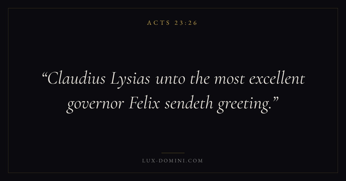 Books / Acts / Chapter 23 / Verse 26 ← Acts 23:25 Acts 23:26 Acts 23:27 → Claudius Lysias unto the most excellent governor Felix sendeth greeting. Download verse card Share on Twitter Share on Facebook Pin it ✦ Key themes Suffering and trialsPrayerTruthSpirit Read with Romans 8:182 Corinthians 4:17Matthew 6:9Luke 18:1 Related topics Bible verses about suffering and trialsBible verses about prayerBible verses about truth ✦ Acts Chapter 23 verses V. 1 V. 2 V. 3 V. 4 V. 5 V. 6 V. 7 V. 8 V. 9 V. 10 V. 11 V. 12 V. 13 V. 14 V. 15 V. 16 V. 17 V. 18 V. 19 V. 20 V. 21 V. 22 V. 23 V. 24 V. 25 V. 26 V. 27 V. 28 V. 29 V. 30 V. 31 V. 32 V. 33 V. 34 V. 35