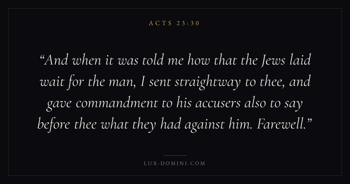 And when it was told me how that the Jews laid wait for the man, I sent straightway to thee, and gave commandment to his accusers also to say before thee what they had against him. Farewell.