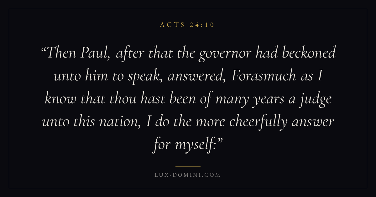 Then Paul, after that the governor had beckoned unto him to speak, answered, Forasmuch as I know that thou hast been of many years a judge unto this nation, I do the more cheerfully answer for myself: