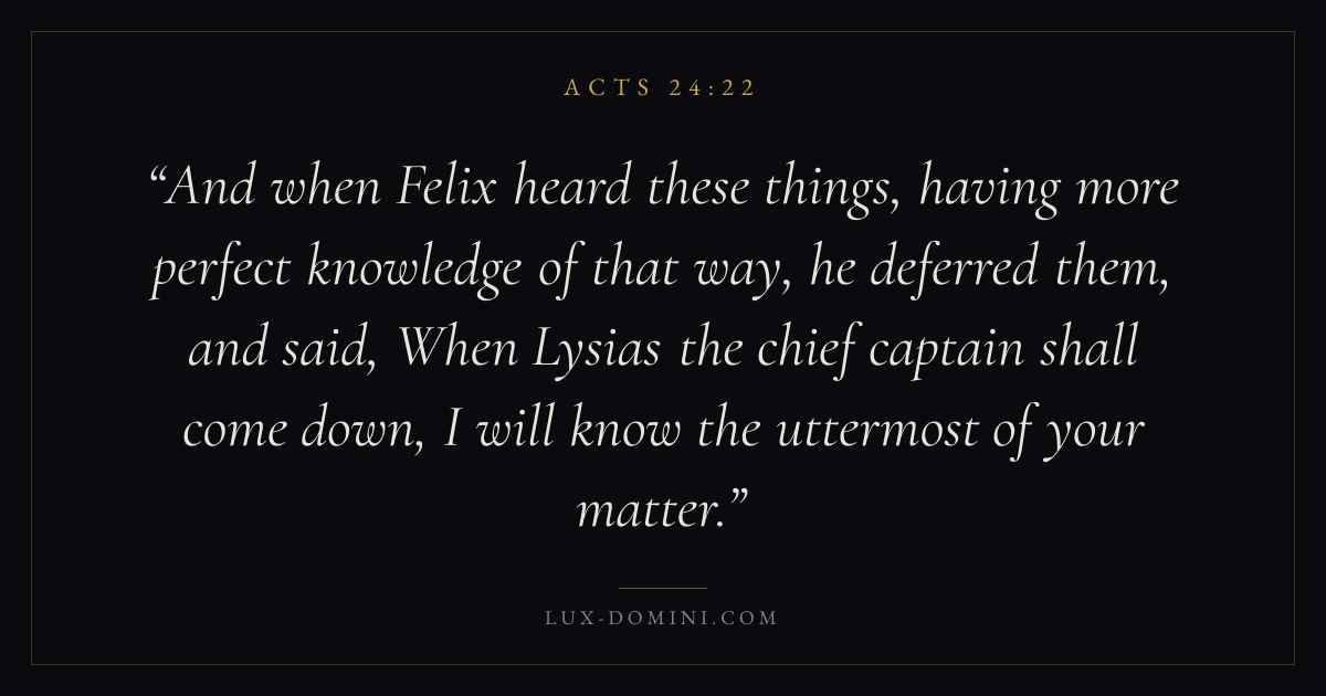 And when Felix heard these things, having more perfect knowledge of that way, he deferred them, and said, When Lysias the chief captain shall come down, I will know the uttermost of your matter.