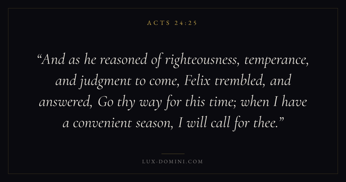 And as he reasoned of righteousness, temperance, and judgment to come, Felix trembled, and answered, Go thy way for this time; when I have a convenient season, I will call for thee.