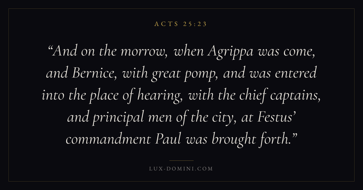 And on the morrow, when Agrippa was come, and Bernice, with great pomp, and was entered into the place of hearing, with the chief captains, and principal men of the city, at Festus’ commandment Paul was brought forth.
