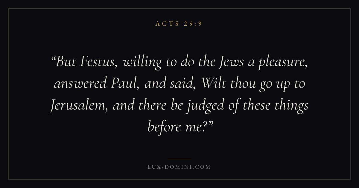 But Festus, willing to do the Jews a pleasure, answered Paul, and said, Wilt thou go up to Jerusalem, and there be judged of these things before me?