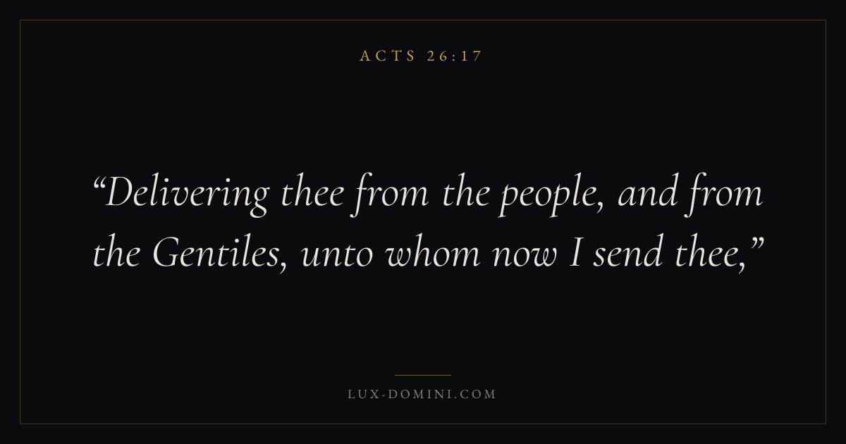 Books / Acts / Chapter 26 / Verse 17 ← Acts 26:16 Acts 26:17 Acts 26:18 → Delivering thee from the people, and from the Gentiles, unto whom now I send thee, Download verse card Share on Twitter Share on Facebook Pin it ✦ Key themes Suffering and trialsPrayerTruthSpirit Read with Acts 26:18Romans 8:182 Corinthians 4:17Matthew 6:9 Related topics Bible verses about suffering and trialsBible verses about prayerBible verses about truth ✦ Acts Chapter 26 verses V. 1 V. 2 V. 3 V. 4 V. 5 V. 6 V. 7 V. 8 V. 9 V. 10 V. 11 V. 12 V. 13 V. 14 V. 15 V. 16 V. 17 V. 18 V. 19 V. 20 V. 21 V. 22 V. 23 V. 24 V. 25 V. 26 V. 27 V. 28 V. 29 V. 30 V. 31 V. 32
