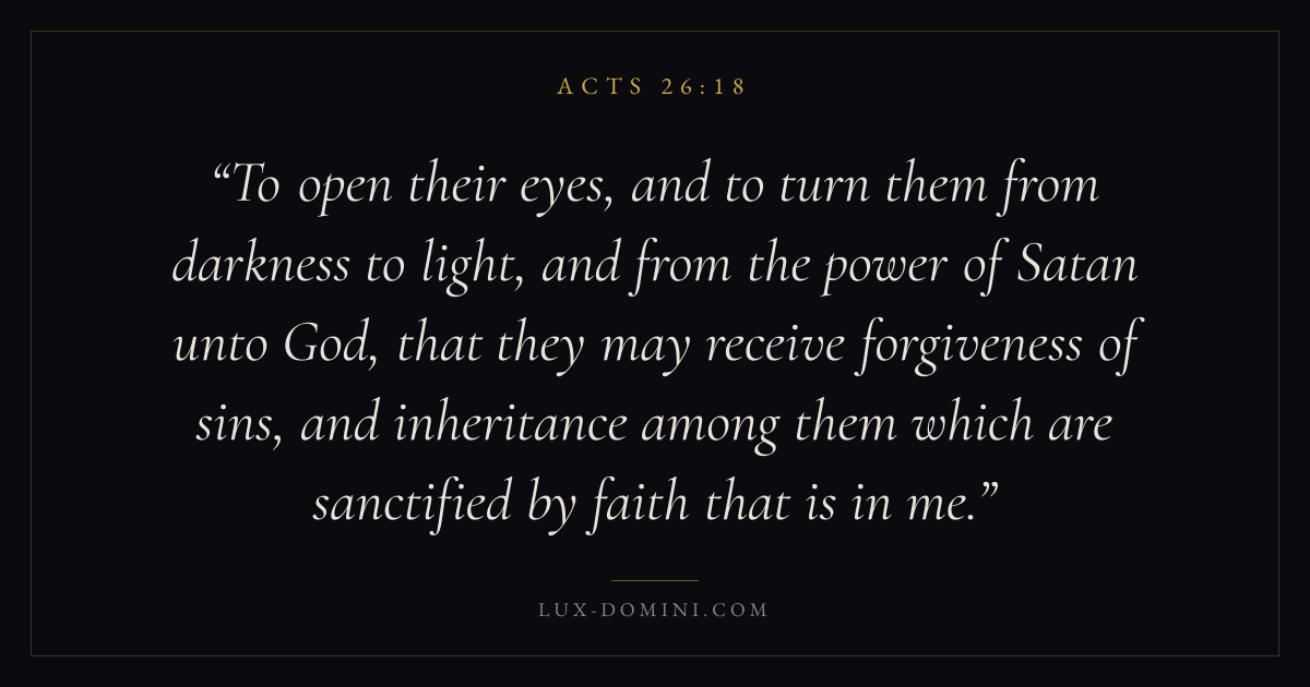 To open their eyes, and to turn them from darkness to light, and from the power of Satan unto God, that they may receive forgiveness of sins, and inheritance among them which are sanctified by faith that is in me.