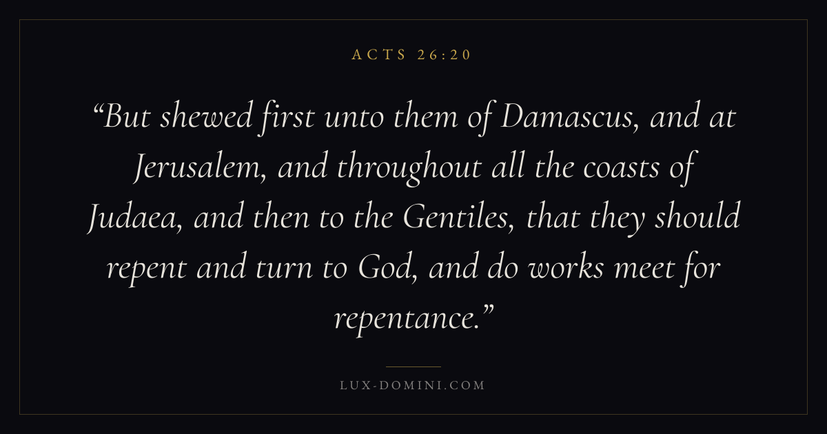 But shewed first unto them of Damascus, and at Jerusalem, and throughout all the coasts of Judaea, and then to the Gentiles, that they should repent and turn to God, and do works meet for repentance.