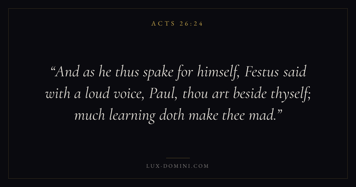And as he thus spake for himself, Festus said with a loud voice, Paul, thou art beside thyself; much learning doth make thee mad.