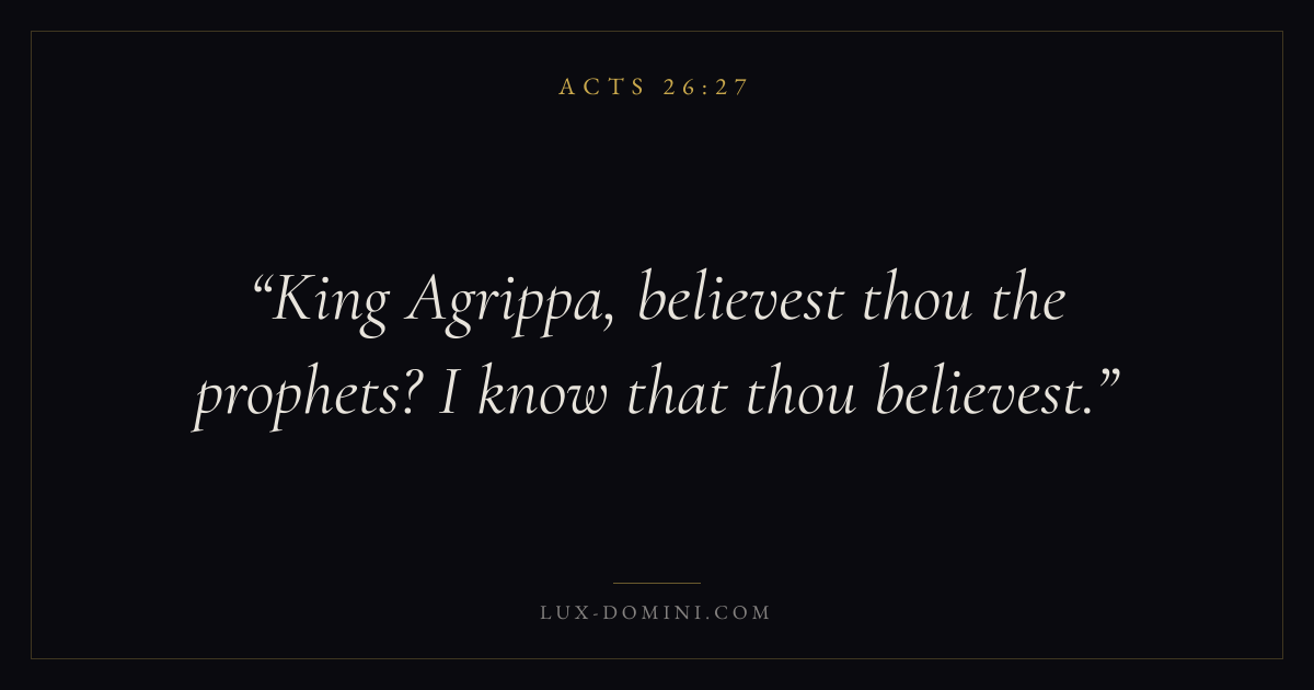 Books / Acts / Chapter 26 / Verse 27 ← Acts 26:26 Acts 26:27 Acts 26:28 → King Agrippa, believest thou the prophets? I know that thou believest. Download verse card Share on Twitter Share on Facebook Pin it ✦ Key themes Anxiety and fearSuffering and trialsPrayerTruthSpirit Read with Acts 26:28Acts 26:29Philippians 4:6Isaiah 41:10 Related topics Bible verses about anxiety and fearBible verses about suffering and trialsBible verses about prayerBible verses about truth ✦ Acts Chapter 26 verses V. 1 V. 2 V. 3 V. 4 V. 5 V. 6 V. 7 V. 8 V. 9 V. 10 V. 11 V. 12 V. 13 V. 14 V. 15 V. 16 V. 17 V. 18 V. 19 V. 20 V. 21 V. 22 V. 23 V. 24 V. 25 V. 26 V. 27 V. 28 V. 29 V. 30 V. 31 V. 32