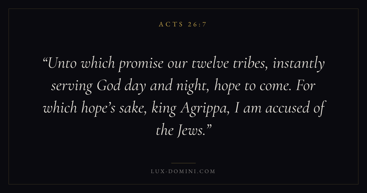 Unto which promise our twelve tribes, instantly serving God day and night, hope to come. For which hope’s sake, king Agrippa, I am accused of the Jews.