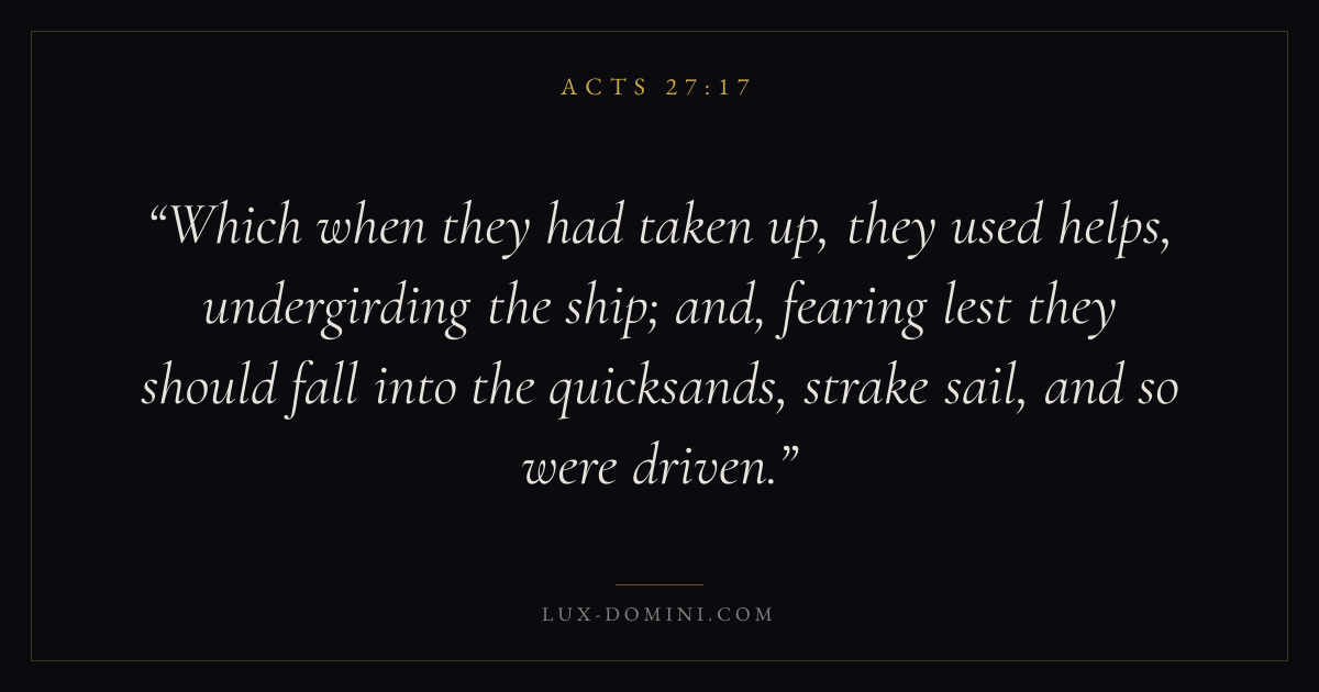 Which when they had taken up, they used helps, undergirding the ship; and, fearing lest they should fall into the quicksands, strake sail, and so were driven.