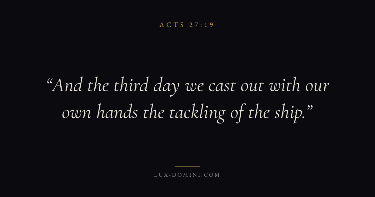 Books / Acts / Chapter 27 / Verse 19 ← Acts 27:18 Acts 27:19 Acts 27:20 → And the third day we cast out with our own hands the tackling of the ship. Download verse card Share on Twitter Share on Facebook Pin it ✦ Key themes Suffering and trialsPrayerTruthSpirit Read with Acts 27:16Acts 27:17Romans 8:182 Corinthians 4:17 Related topics Bible verses about suffering and trialsBible verses about prayerBible verses about truth ✦ Acts Chapter 27 verses V. 1 V. 2 V. 3 V. 4 V. 5 V. 6 V. 7 V. 8 V. 9 V. 10 V. 11 V. 12 V. 13 V. 14 V. 15 V. 16 V. 17 V. 18 V. 19 V. 20 V. 21 V. 22 V. 23 V. 24 V. 25 V. 26 V. 27 V. 28 V. 29 V. 30 V. 31 V. 32 V. 33 V. 34 V. 35 V. 36 V. 37 V. 38 V. 39 V. 40 V. 41 V. 42 V. 43 V. 44