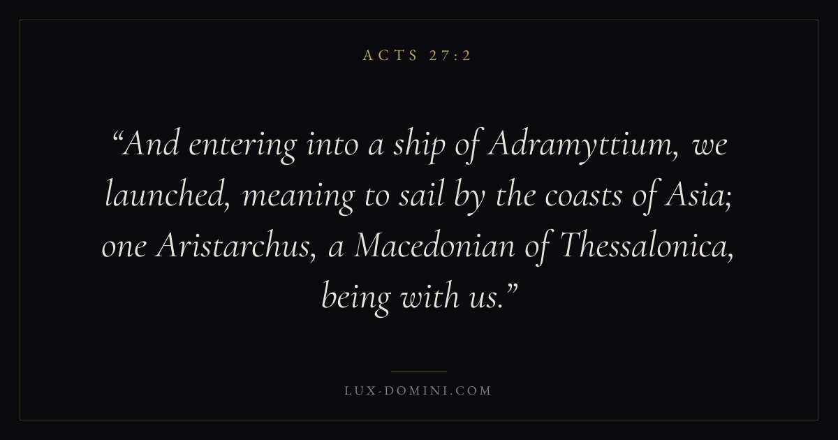 And entering into a ship of Adramyttium, we launched, meaning to sail by the coasts of Asia; one Aristarchus, a Macedonian of Thessalonica, being with us.