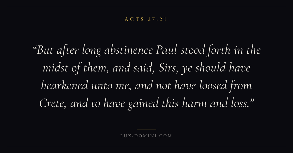 But after long abstinence Paul stood forth in the midst of them, and said, Sirs, ye should have hearkened unto me, and not have loosed from Crete, and to have gained this harm and loss.