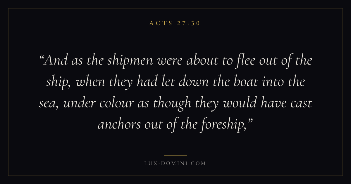 And as the shipmen were about to flee out of the ship, when they had let down the boat into the sea, under colour as though they would have cast anchors out of the foreship,